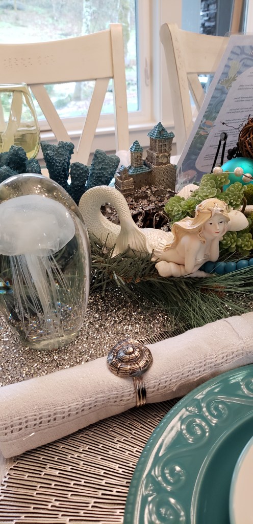 When talking about mermaids, it’s all about blue and green. To decorate the table, I mixed blue, green, and ivory dishes I found at discount stores. I particularly love shopping at Tuesday Morning, HomeGoods, Ross Dress for Less, T.J.Maxx, Marshalls, and even scout Goodwill for dishes. January is the best time to shop after Christmas sales and this lovely silver and teal garland was on sale for 75% off. There’s nothing I love better than finding bargains! After adding seashells, some sparkling white Christmas picks, teal berries, and beads, it looks like an under the sea dream!