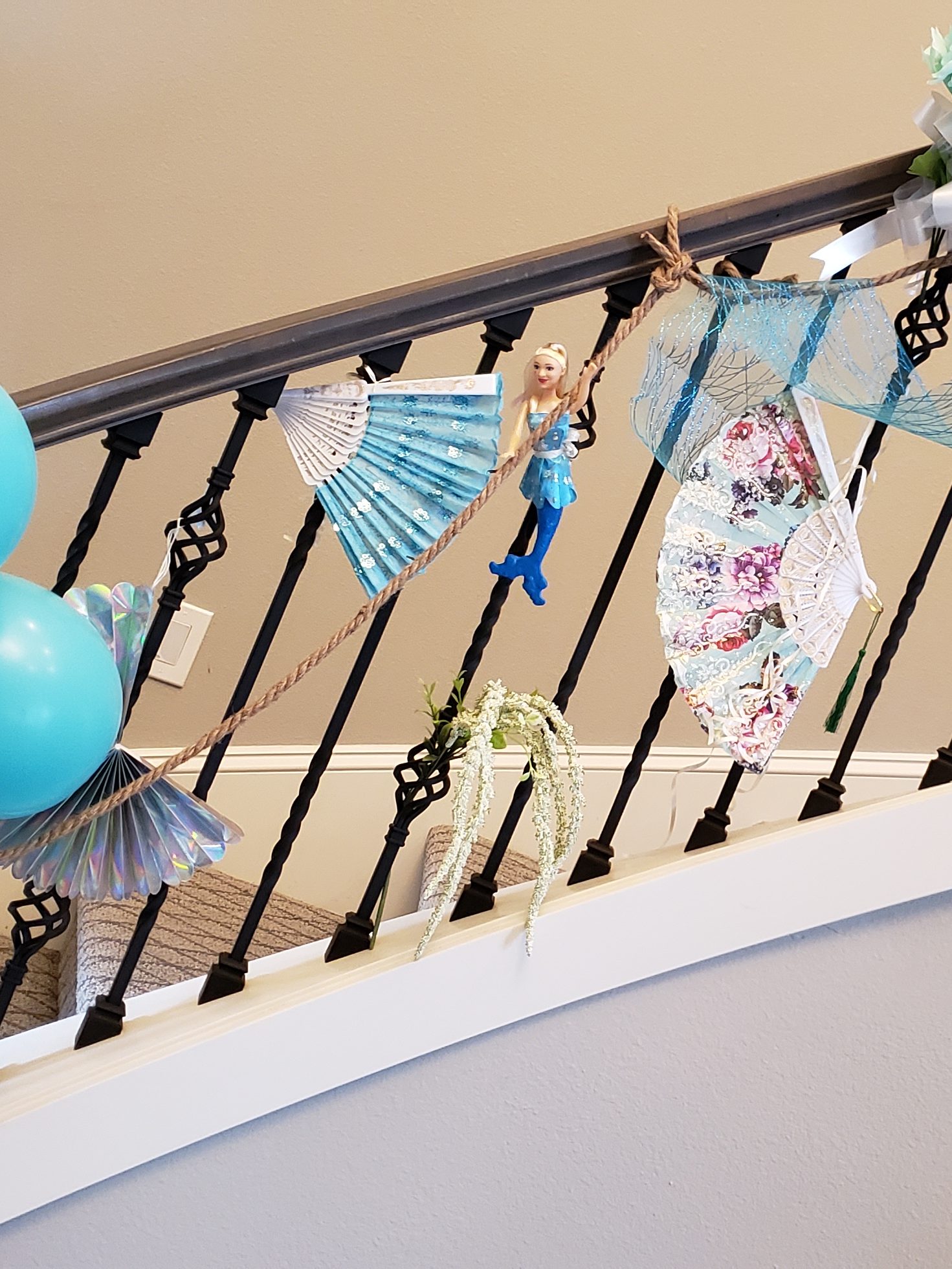 Though I love the puffy look of the paper flowers, I’ll probably stick to the colored fans. They’re easy to keep and store for later use. The Dollar Tree Mermaids make great giveaways for young visitors but for some reason they didn’t have too many at this time of year. I found the Chinese fans and artificial flowers at the Dollar Tree store too and just selected the colors that would match my theme.