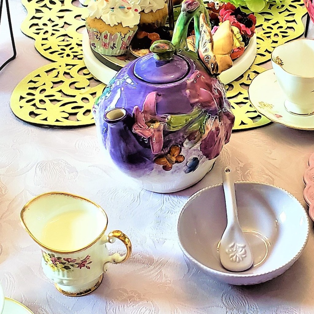 The teapots we used were my purple butterflies made by one of my favorite stores, Blue Sky Clayworks. I used their floral dessert plates in pastel colors as well. For the teacups and decorations, I just chose assorted flower print colors in pastels and clipped a butterfly to each cup.