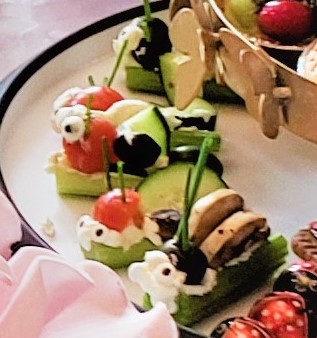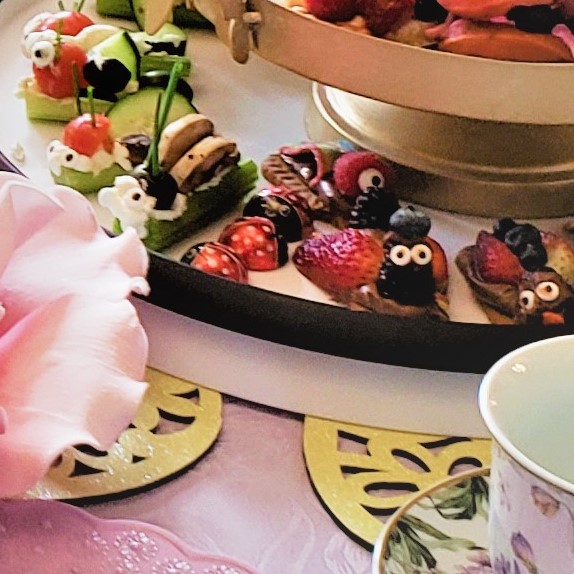 This was a fun party because it was a bit hands-on for the kids. My guests both young and even not as young as they once were, loved helping make the fruit and veggie bugs for the tea party.