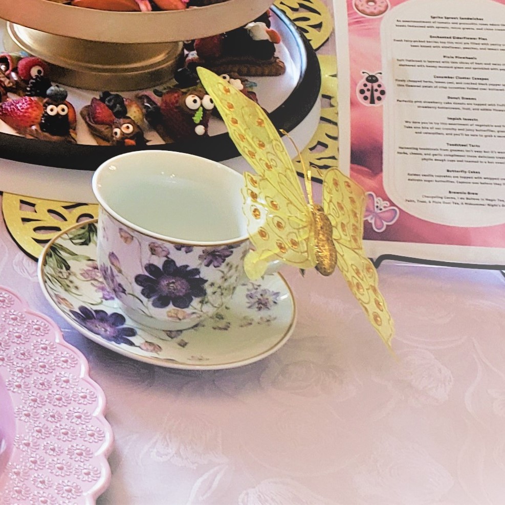 Fruit, flowers, butterflies, bugs and everything sparkle is what’s required for a fairy garden tea party. Since I couldn’t find any fairy napkin rings, I used gold butterflies instead. My yellow butterfly placemats made a great table runner too!