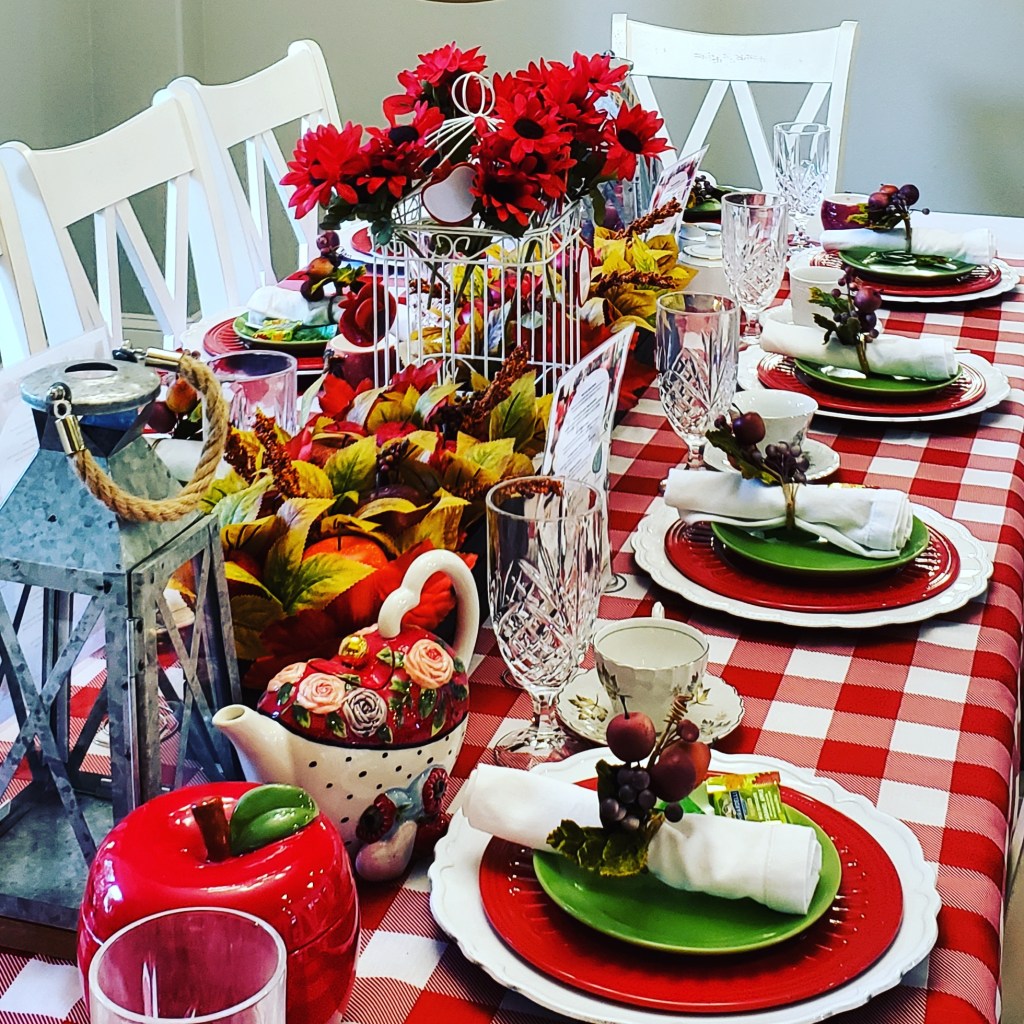 My second favorite addition was the yellow checkered table runner from Home Goods. After that, adding Dollar Store daisies, black and white napkins, and mismatched teacups was easy. The bumblebee tea for one teapot is in my store. It’s from my favorite teapot maker, Blue Sky Clayworks.