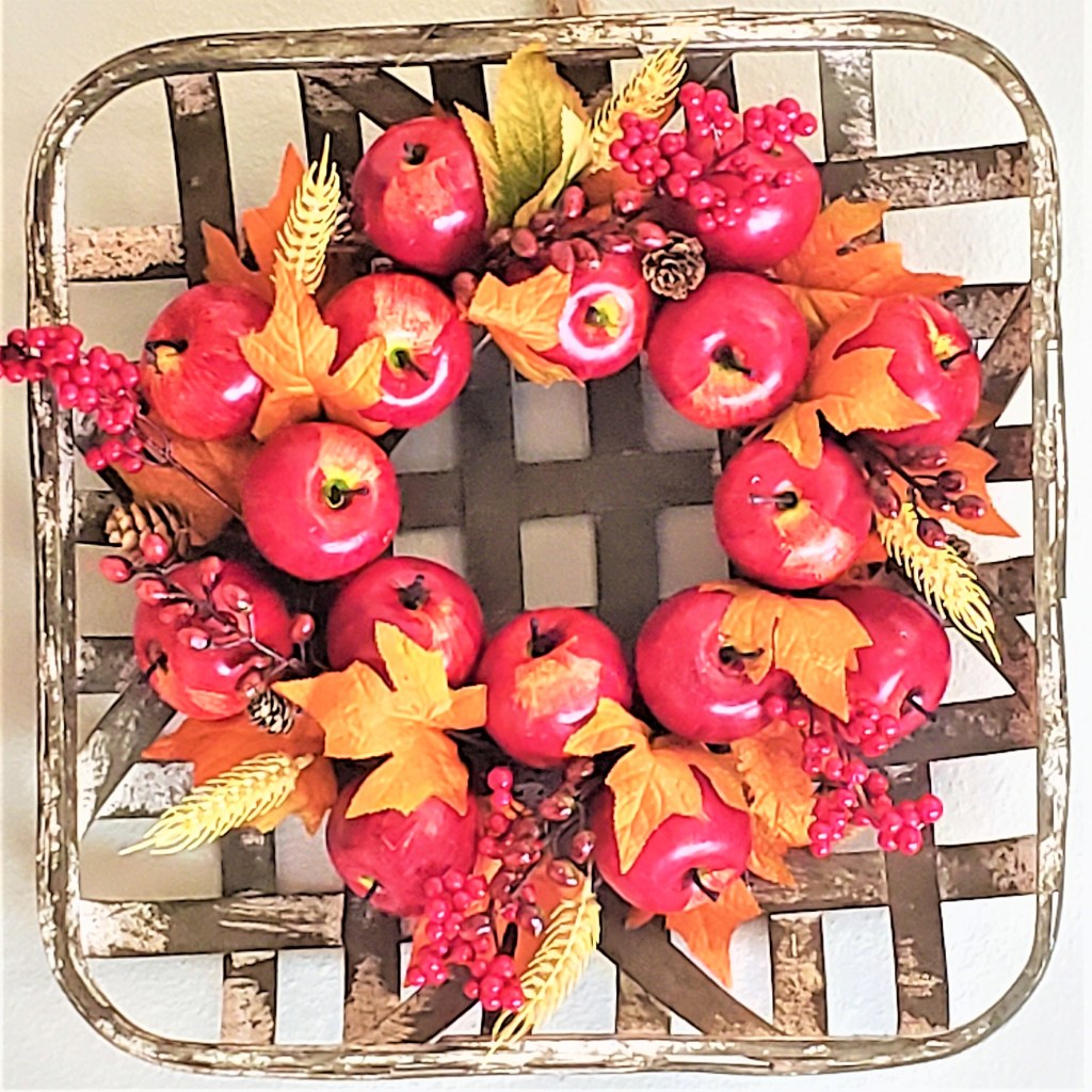 Isn’t this apple wreath a beauty? I can’t believe I found apple wired ribbon. It came from a new favorite online store called CraftOutlet.com. You can get lost for hours looking through that place. To make these fat bows I’d suggest getting two and one-half inch wide ribbon. There are some great tutorials online that teach you how to make your own bows. I never buy them now. I like mine very full and the store employees are taught to make them skinny.