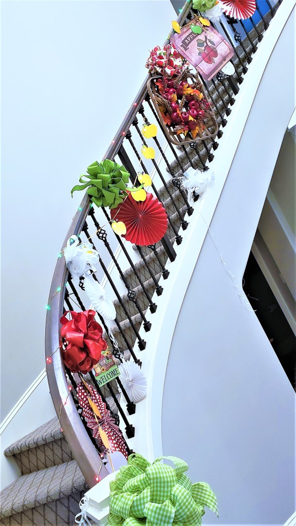 The stairs were decorated with red, green, white, and checked bows and fans. I even found some apple wired ribbon, believe it or not. My new purchase is an LED light strand I can program with any combination of colors so I can keep it up year-round.