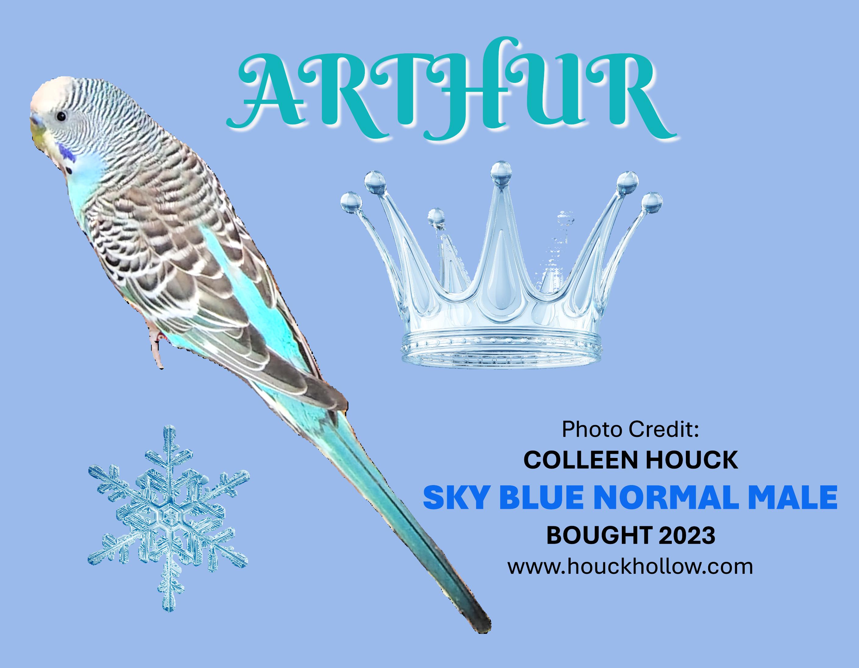 One of our rare pet store purchases, Arthur has proved to be a great dad. He and his mate Guinevere are very happy together and great parents. He is a gorgeous sky-blue color and a very dedicated dad.