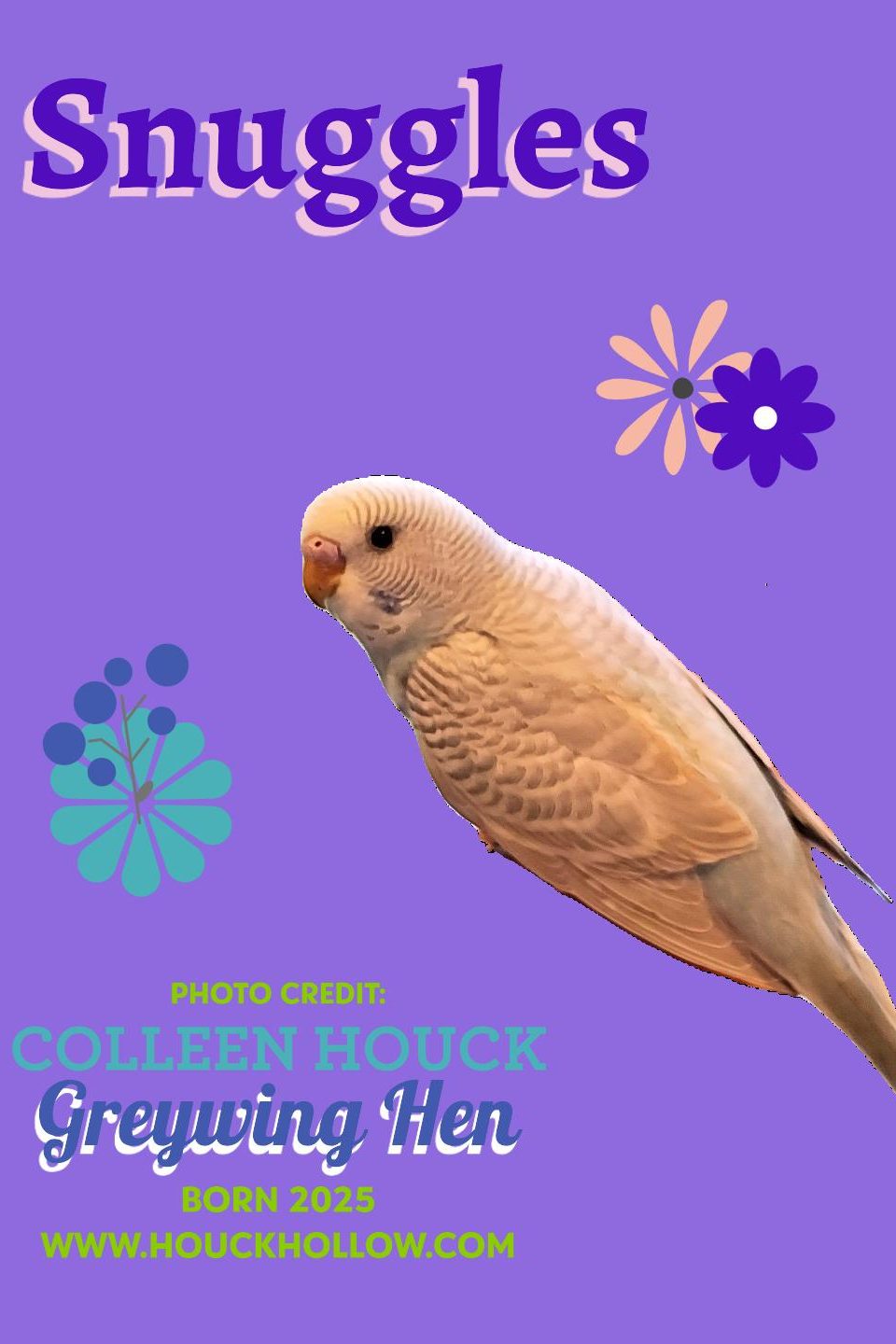 Snuggles was the cutest baby. She got her name from climbing in our pockets. When she quickly outgrew mom and dad, we realized she was different. This part English Budgie still adores her foster dad.