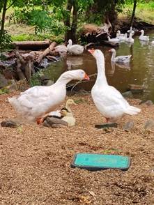 Papa knew he was especially clingy and overly careful, honking fearfully anytime Daffy wanted to head off to play with other ducks, and he relied on the sharp eyes and ears of his young gander sons to look for trouble and to help protect their mama, Snow.