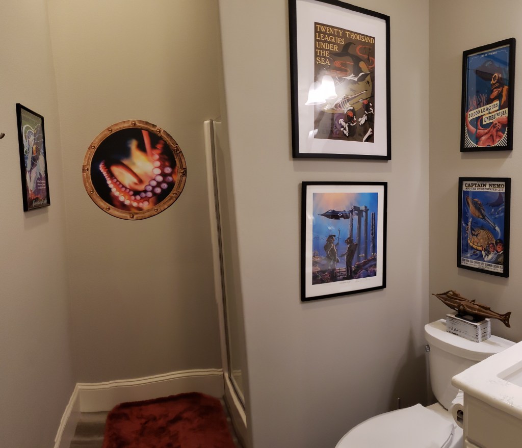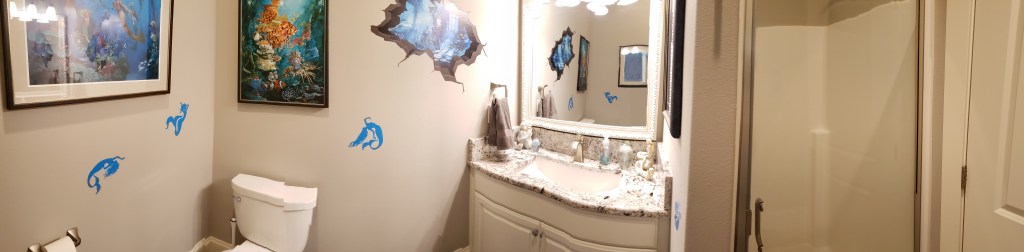 The photo doesn’t do this bathroom justice. There is some fabulous art in here. This was was decorated to go with the mermaids in my book, Tiger’s Voyage.